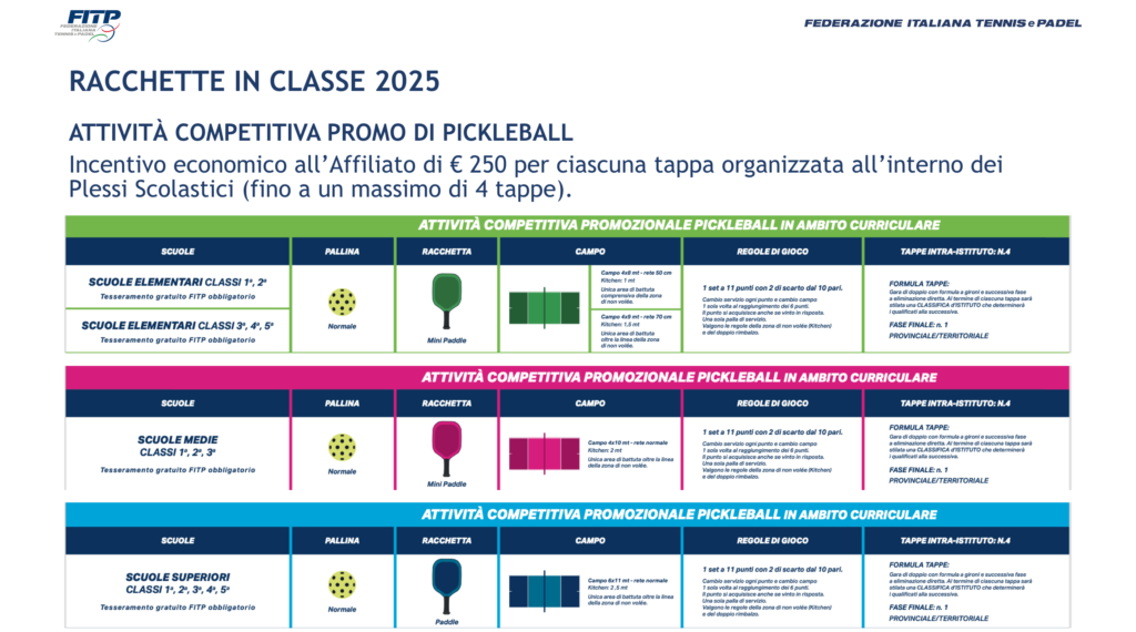 A proposito di formazione, nascono quest’anno le scuole di pickleball, con tre tipologie previste nel breve termine: La prima a partire sarà la Club (coordinata anche da Istruttori di primo livello), poi seguiranno la Basic (con Istruttori di secondo livello e Maestri nazionali) e la Standard (solo con Maestri nazionali).