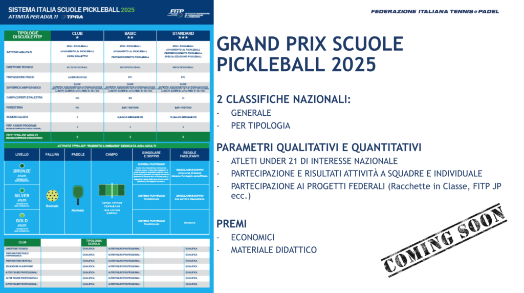 Per chiudere, il direttore dell’ISF illustra altre tre novità del 2025 che vanno a completare l’offerta per gli amanti del pickleball. “La prima: nascerà il Grand Prix delle scuole di pickleball, sulla falsariga di quello delle scuole di tennis, che premia la qualità delle scuole e del loro lavoro, a prescindere dal luogo di tesseramento.