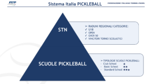 A proposito di formazione, nascono quest’anno le scuole di pickleball, con tre tipologie previste nel breve termine: La prima a partire sarà la Club (coordinata anche da Istruttori di primo livello), poi seguiranno la Basic (con Istruttori di secondo livello e Maestri nazionali) e la Standard (solo con Maestri nazionali).