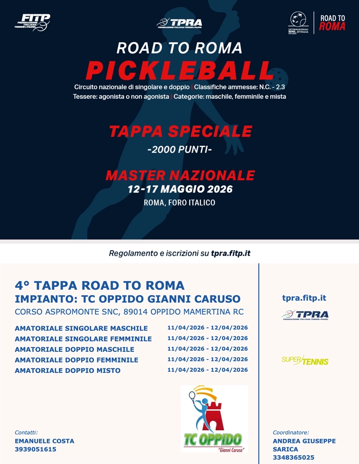 Il circuito Road to Roma 2026 TPRA Pickleball continua la sua corsa con una nuova tappa in programma sabato 11 e domenica 12 aprile 2026 presso il CT Oppido “Gianni Caruso”.